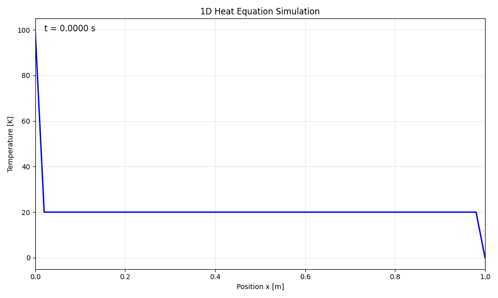 Animation of the 1D heat equation solution showing temperature diffusing from a hot boundary (left, 100K) through an initially cold material toward a cold boundary (right, 0K).¶