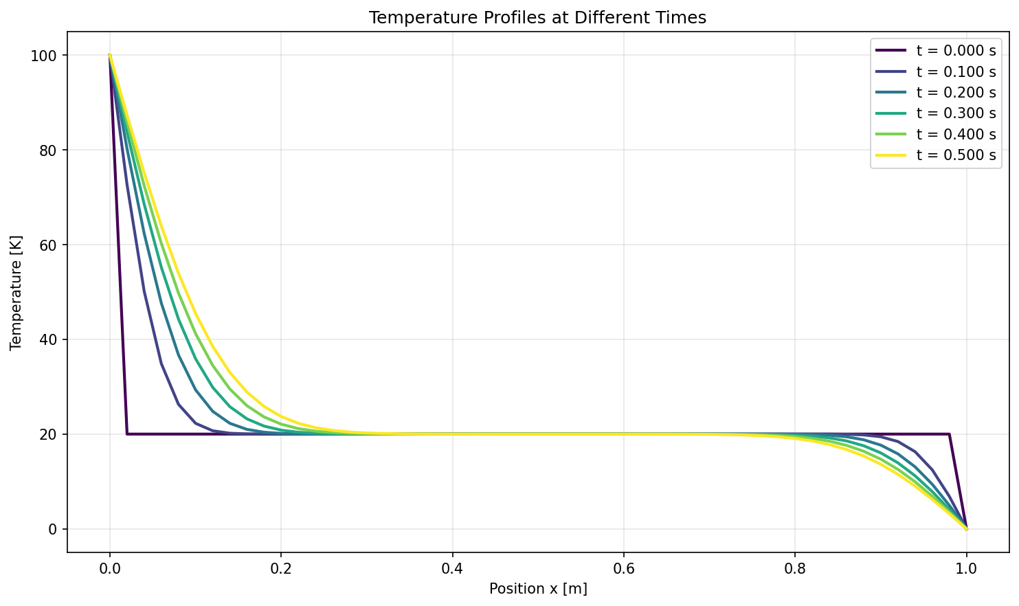 Temperature profiles at different simulation times, showing heat diffusing from the hot boundary (100K at x=0) toward the cold boundary (0K at x=1).¶